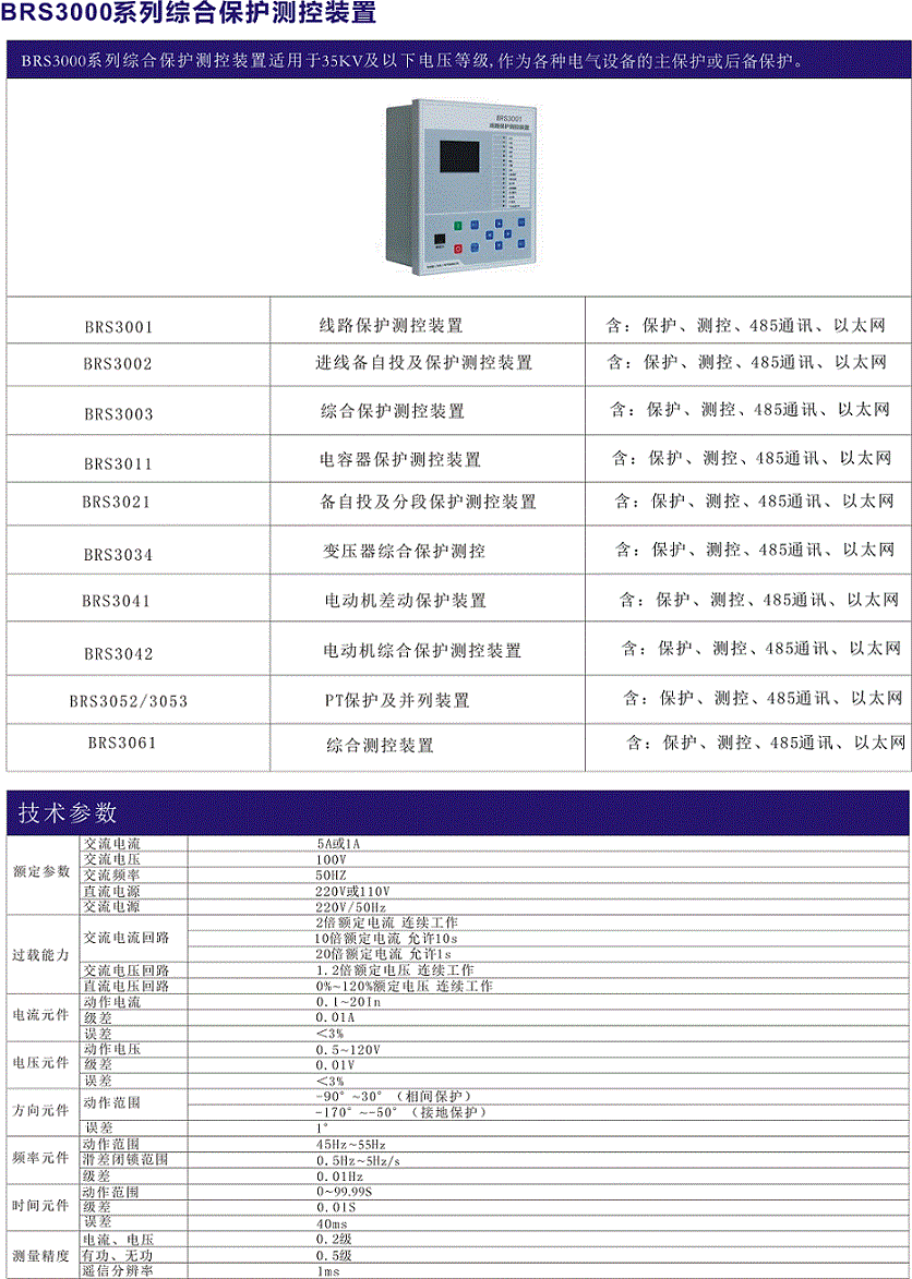 BRS3000系列保護(hù)測控裝置是在多年實(shí)踐應(yīng)用和運(yùn)行經(jīng)驗(yàn)的基礎(chǔ)上,吸取了國內(nèi)外微機(jī)保護(hù)裝置現(xiàn)有的先進(jìn)技術(shù),研制推出的新一代微機(jī)保護(hù)測控裝置。廣泛適用于電力、水利、石油、化工等行業(yè)35KV及以下電壓等級系統(tǒng),作為各種電氣設(shè)備的主保護(hù)或后備保護(hù)。
