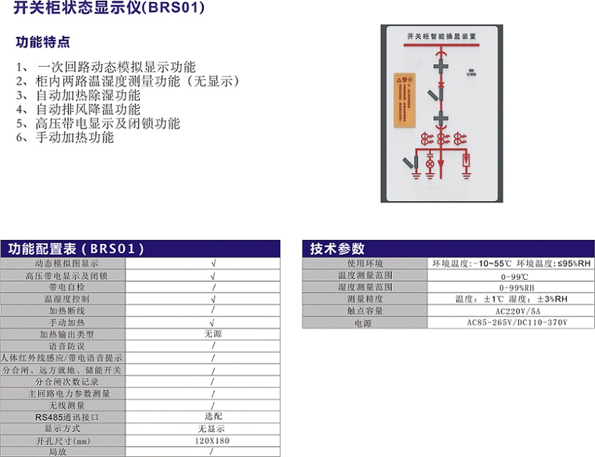 BRS01高壓開關(guān)柜狀態(tài)顯示儀是根據(jù)當前中壓系統(tǒng)開關(guān)柜技術(shù)發(fā)展而設(shè)計開發(fā)的一種新型的模塊化、狀態(tài)顯示裝置。該系列產(chǎn)品集回路模擬指示、帶電指示及閉鎖功能、溫濕度測量、自動加熱除濕控制、自動排風降溫控制、斷路器分合閘狀態(tài)指示、儲能、接地開關(guān)指示、手車位置指示等功能。該系列產(chǎn)品以一體化布局配套裝備于開關(guān)柜,將簡化開關(guān)柜的面板結(jié)構(gòu)設(shè)計,美化開關(guān)柜的面板布局,完善開關(guān)狀態(tài)的指示功能和安全性能。