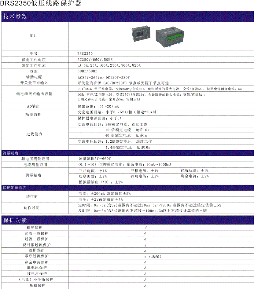 BRS2350低壓線路保護(hù)器為低壓回路提供了一整套集控制、保護(hù)、測量、計(jì)量和通迅于一體的專業(yè)化解決方案,同時(shí)提供了遠(yuǎn)程自動(dòng)控制、現(xiàn)場直接控制、面板指示、信號(hào)報(bào)警、操作記錄、脫扣報(bào)警記錄及開關(guān)量記錄等功能,大量適用于電力、石化、輕工、煤炭、造紙、鋼鐵、冶金等諸多行業(yè)。