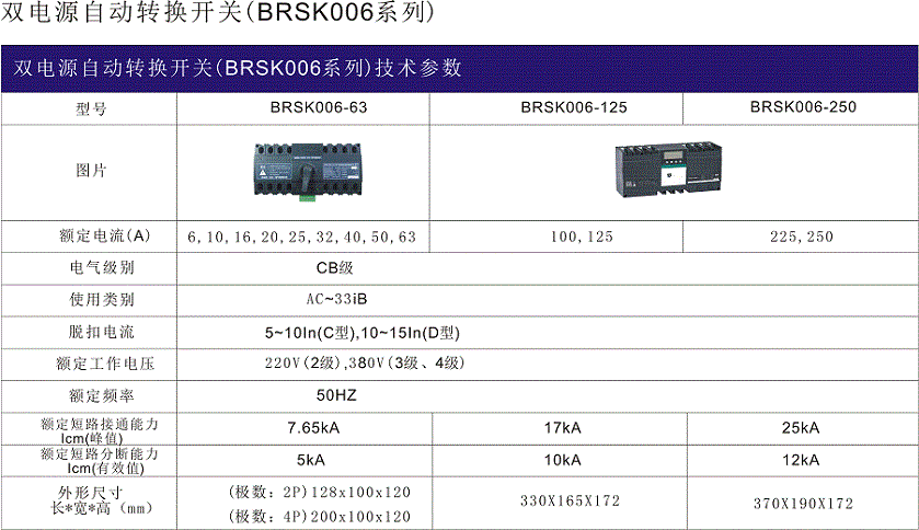 BRSK006系列雙電源自動轉(zhuǎn)換開關(guān)是終端型自動切換裝置,適用于交流50HZ,額定電壓400V/230V;額定電流6A-250A的三相四線(也可用于一相一線)雙路供電電網(wǎng)中,當(dāng)一路電源發(fā)生故障(檢測常用A相電壓及備用A相電壓,失壓和缺相)時(shí)自動將一個(gè)或幾個(gè)負(fù)載電路從一路電源接至另一路電源,以保證負(fù)載電壓的正常供電。