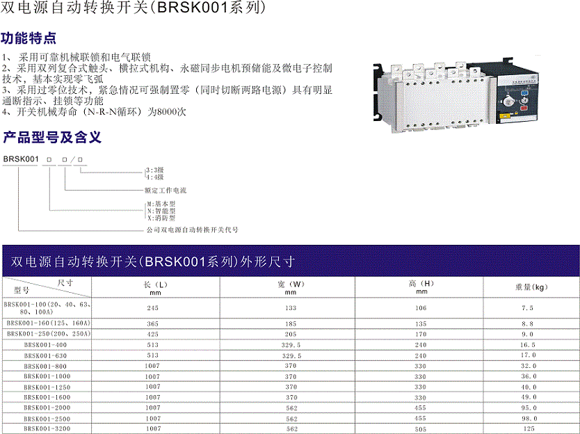 BRSK001系列雙電源自動(dòng)轉(zhuǎn)換開關(guān)適用于交流50HZ,額定電壓400V及以下,額定電流20-3200A緊急供電系統(tǒng)的兩路電源的相互轉(zhuǎn)換,可以完成常用電源和備用電源的自動(dòng)轉(zhuǎn)換而無需人工進(jìn)行操作。