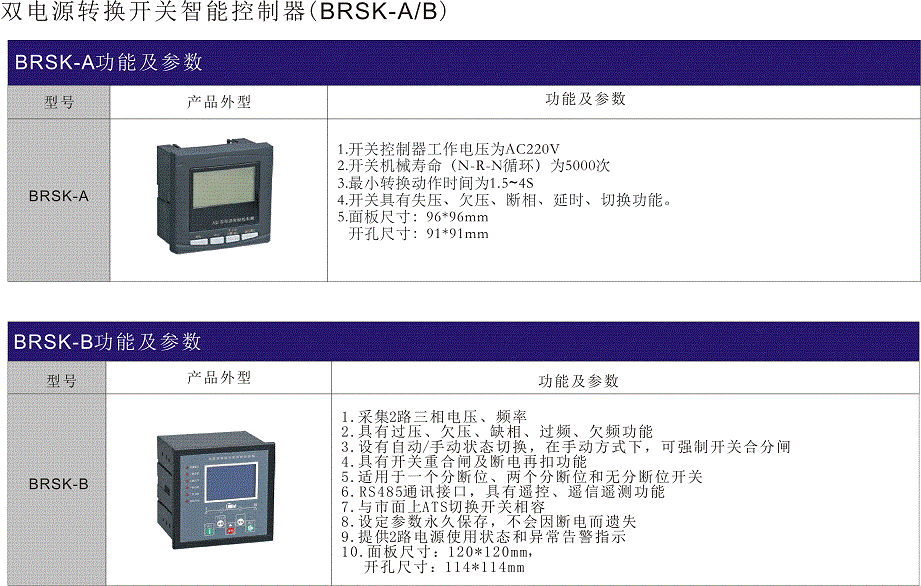BRSK-A/B系列雙電源轉(zhuǎn)換開關(guān)智能控制器是一個具有可編程功能,自動化測量、LCD顯示、數(shù)據(jù)通訊為一體的智能化雙電源切換控制器。雙電源轉(zhuǎn)換開關(guān)智能控制器提供了雙路電源轉(zhuǎn)換開關(guān)(ATS)所必要的監(jiān)控與保護,以確保切換開關(guān)維持正常的運行。