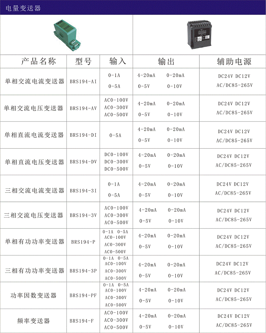 電量變送器是一種將被測電量(交流電壓、電流、有功功率、無功功率、有功電能、無功電能、頻率、相位、功率因數(shù)、直流電壓、電流等)轉(zhuǎn)換成按線性比例直流電流或電壓信號輸出(電能脈沖輸出)的測量儀表,百瑞順電量變送器系列產(chǎn)品具有精度高,體積小、功耗小、頻響寬、抗干擾等特性。